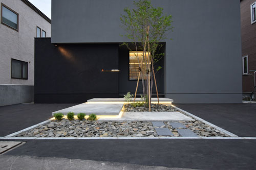 間接照明に照らされた塗壁・黒の御影石に映された植栽。