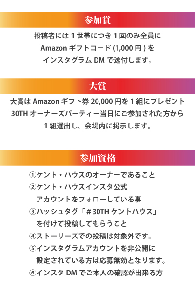 インスタグラムで「#30thケントハウス」のハッシュタグを付けて投稿するだけで応募は完了です。