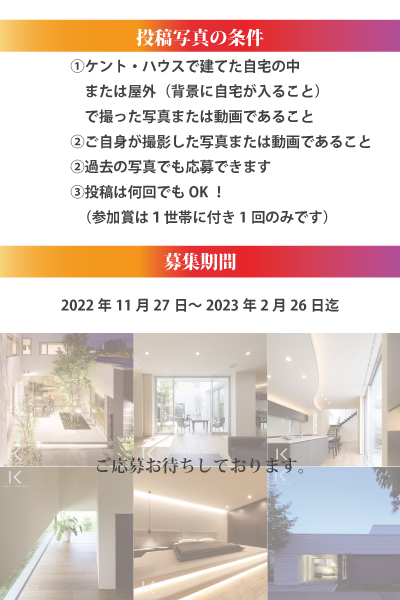 ケント・ハウス創立30周年を記念しまして、今まで建てて頂きましたオーナー様のご自宅で撮って頂きましたお写真を投稿してみませんか?