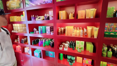 アーユルヴェーダ専門医の監修のもと、王室伝承のレシピに基づいて高品質なハーブや植物オイルをブレンドしたスキンケアアイテムが揃い、店内にはカラフルで洗練されたパッケージの商品がずらりと並んでいました。