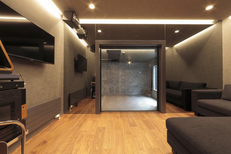 隣接するカラオケルームからはガレージの様子を眺められるよう計画しています。