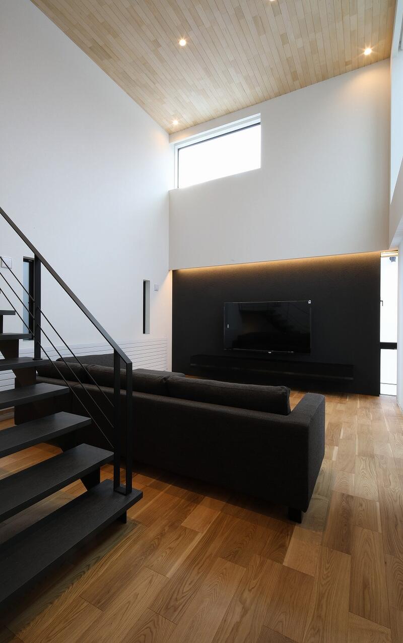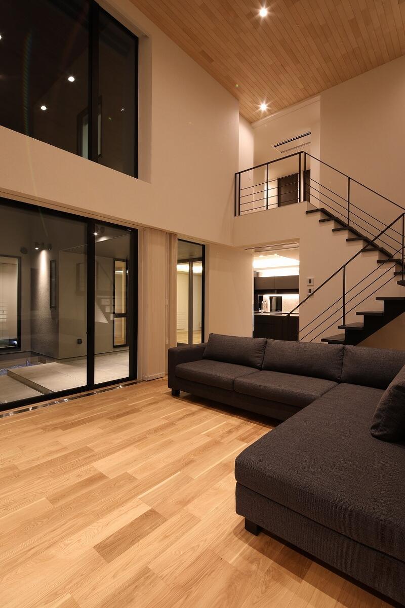 天井にはひばの羽目板を採用し、木の温もりに包まれるリビング。